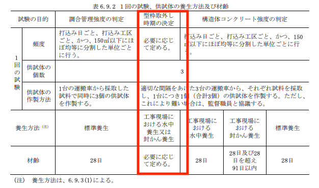 ここで注意が必要ですが、型枠取り外し時期の決定のための供試体は標準養生ではありません。